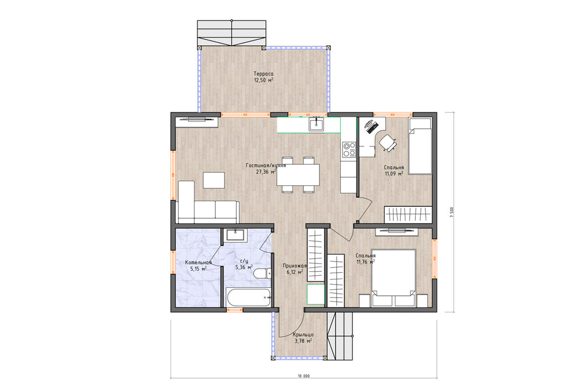 Дом достаточно комфортабельный. Кровля утеплена, есть выведенная наружу труба. За небольшую доплату проект "Премиум 75" можно доработать под ваши требования, например, изменить планировку, добавить помещений, увеличить или изменить крыльцо, достроить гараж.
