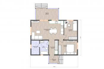 С крыльца вы попадаете попадает в тамбур и только потом - в холл. Из холла можно перейти в кладовую, санузел, спальню, кухню-столовую или гостиную. Из гостиной есть выход на крытую террасу и установлена лестница по которой можно подняться на второй этаж.