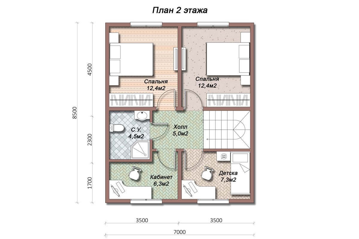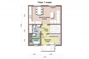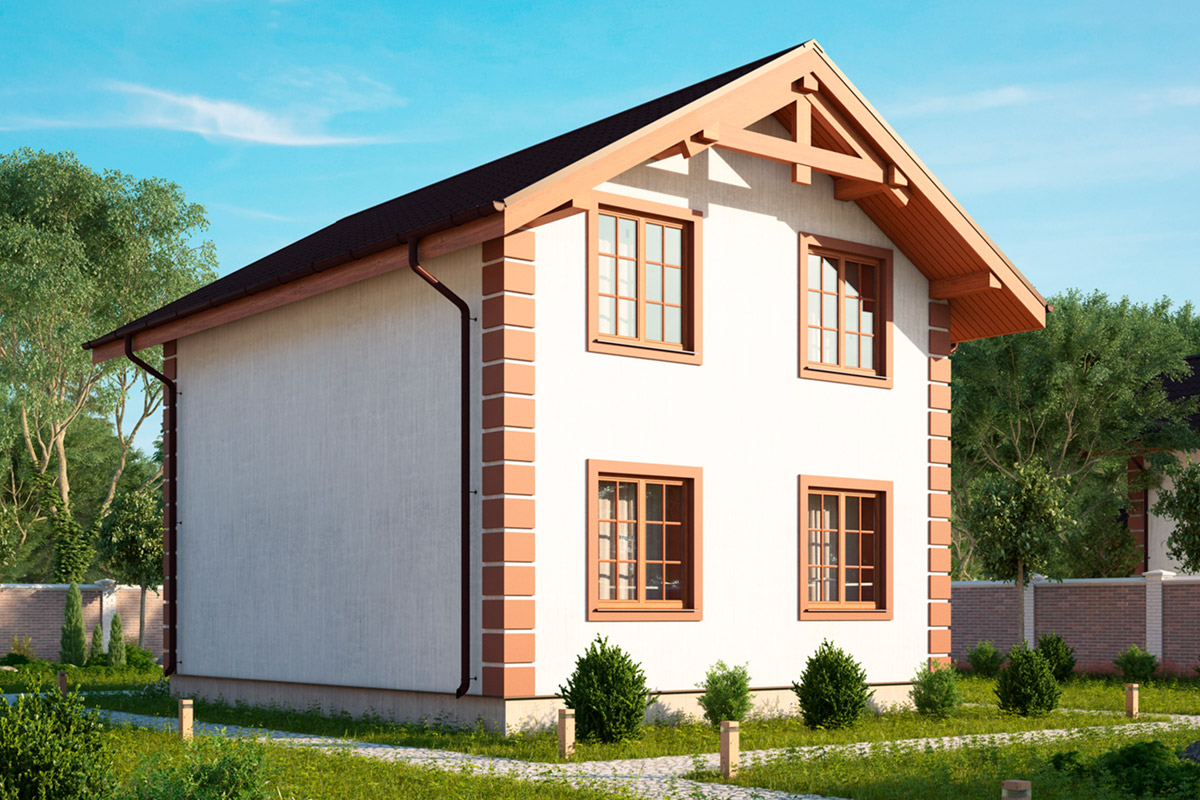 Проект двухэтажного дома возможно возведение из материалов: газобетон, керамический блок или по каркасной технологии, размеры строения 8,5 x 7 метров и имеет площадь 120 квадратных метра, спроектирован для комфортного размещения семей с детьми, родственниками или друзьями.