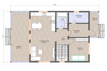 С крыльца вы попадаете попадает в тамбур и только потом - в холл. Из холла можно перейти в кладовую, санузел, спальню, кухню-столовую или гостиную. Из гостиной есть выход на крытую террасу и установлена лестница по которой можно подняться на второй этаж.