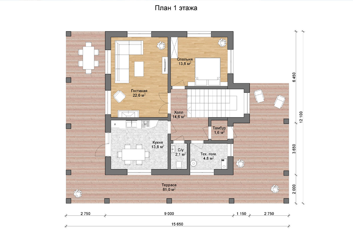 С крыльца вы попадаете попадает в тамбур и только потом - в холл. Из холла можно перейти в кладовую, санузел, спальню, кухню-столовую или гостиную. Из гостиной есть выход на крытую террасу и установлена лестница по которой можно подняться на второй этаж.