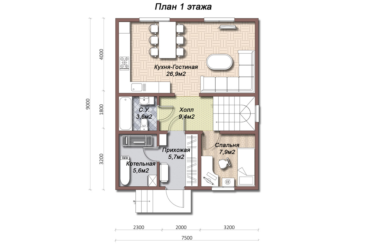 С крыльца вы попадаете попадает в тамбур и только потом - в холл. Из холла можно перейти в кладовую, санузел, спальню, кухню-столовую или гостиную. Из гостиной есть выход на крытую террасу и установлена лестница по которой можно подняться на второй этаж.