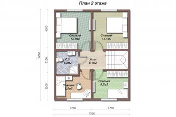 Проект двухэтажного дома возможно возведение из материалов: газобетон, керамический блок или по каркасной технологии, размеры строения 9 x 7,5 метров и имеет площадь 135 квадратных метра, спроектирован для комфортного размещения семей с детьми, родственниками или друзьями.
