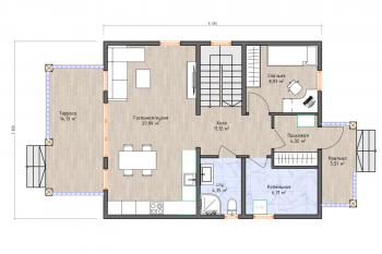 С крыльца вы попадаете попадает в тамбур и только потом - в холл. Из холла можно перейти в кладовую, санузел, спальню, кухню-столовую или гостиную. Из гостиной есть выход на крытую террасу и установлена лестница по которой можно подняться на второй этаж.