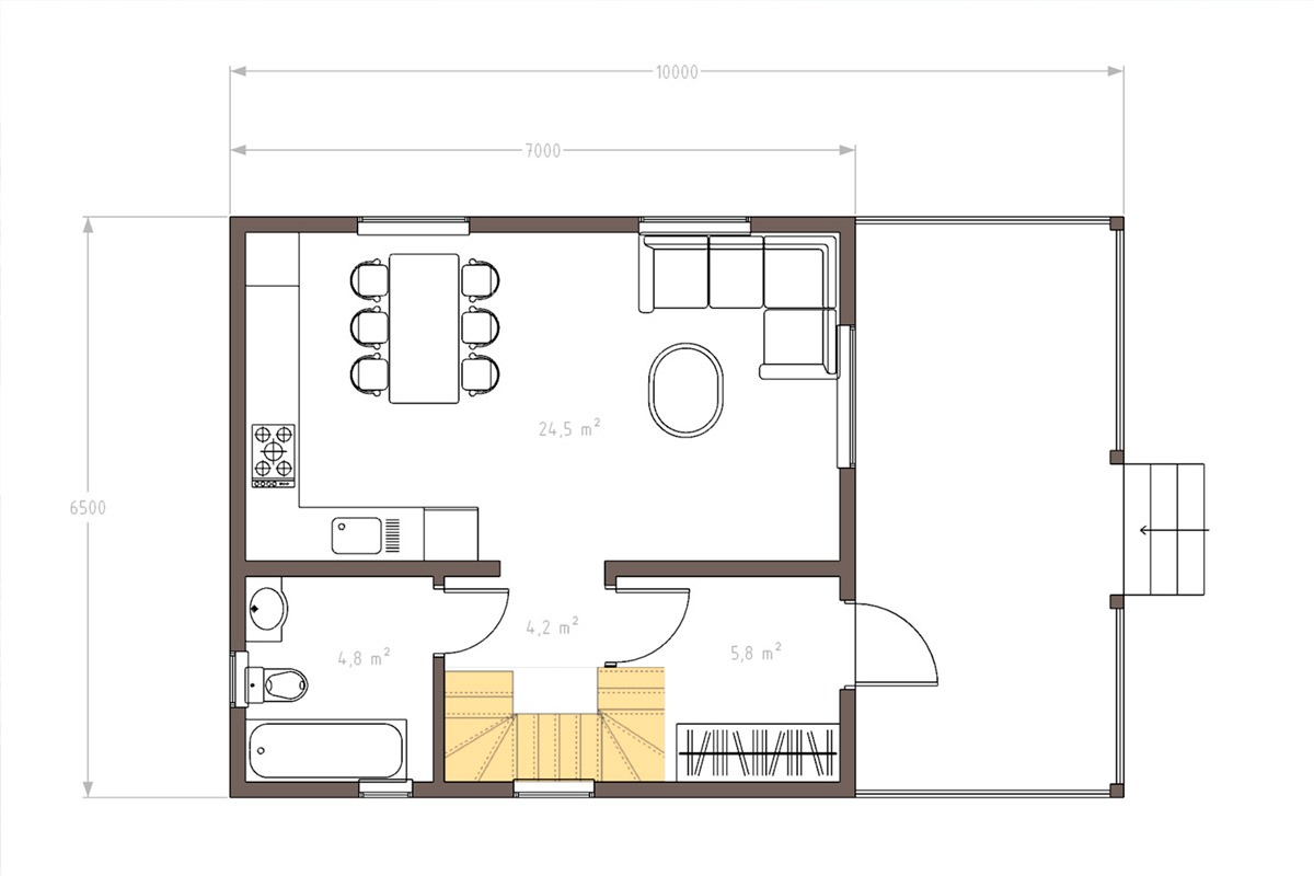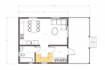 С крыльца вы попадаете попадает в тамбур и только потом - в холл. Из холла можно перейти в кладовую, санузел, спальню, кухню-столовую или гостиную. Из гостиной есть выход на крытую террасу и установлена лестница по которой можно подняться на второй этаж.