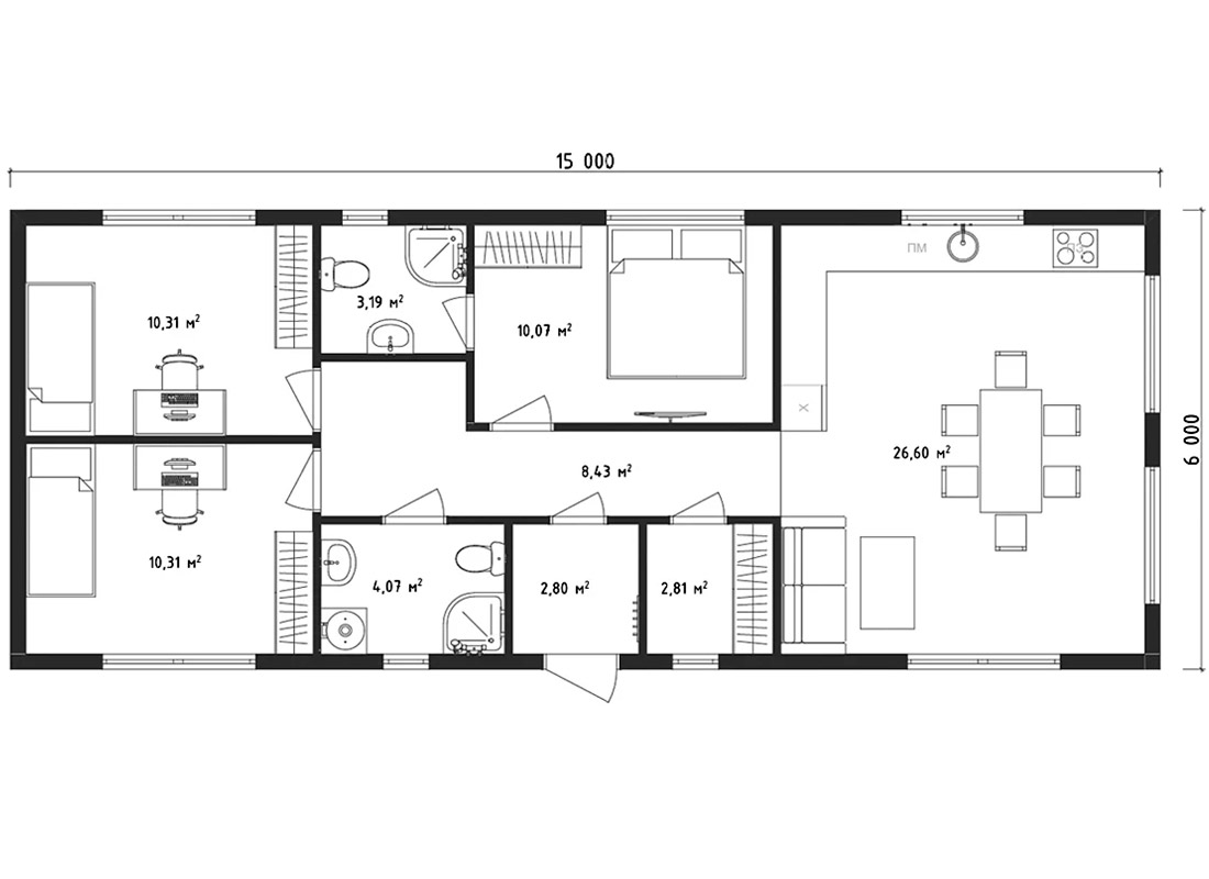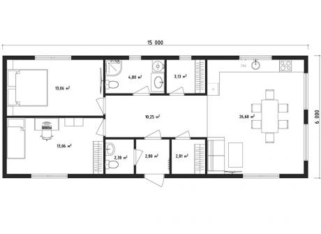 Проект двухэтажного дома возможно возведение из материалов: газобетон, керамический блок или по каркасной технологии, размеры строения 15 x 6 метров и имеет площадь 90 квадратных метра, спроектирован для комфортного размещения семей с детьми, родственниками или друзьями.